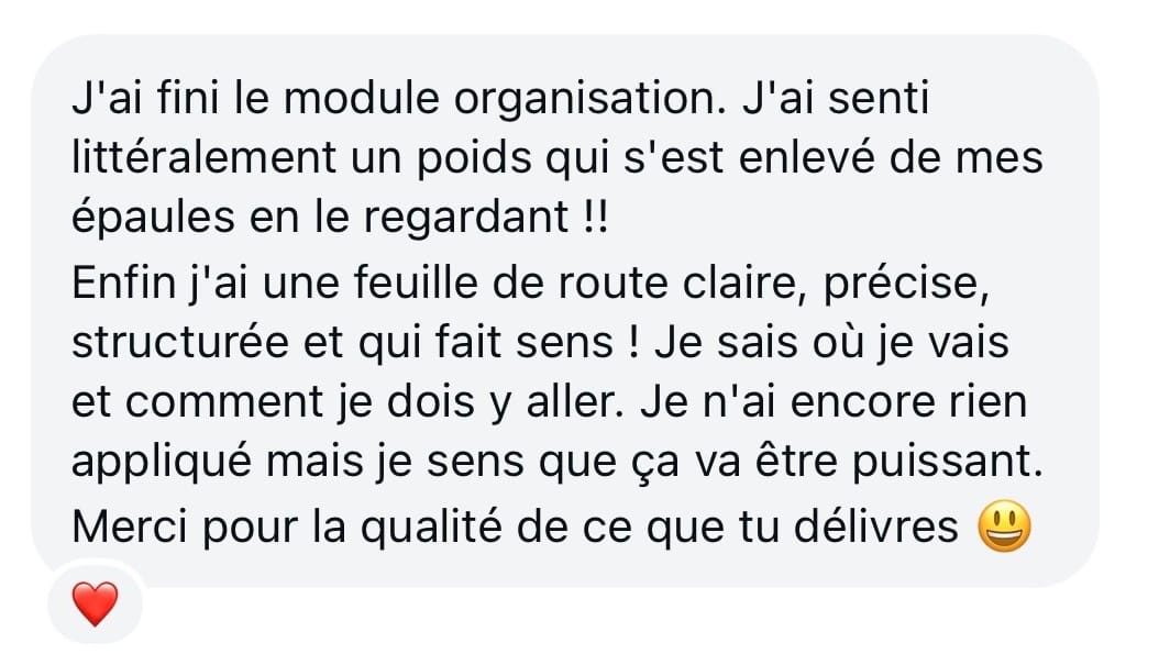 C'est pour cette raison que les modules sont découpés en vidéos qui font 35 minutes maximum. Tu peux avancer à ton rythme, quand tu veux. Pas de pression.